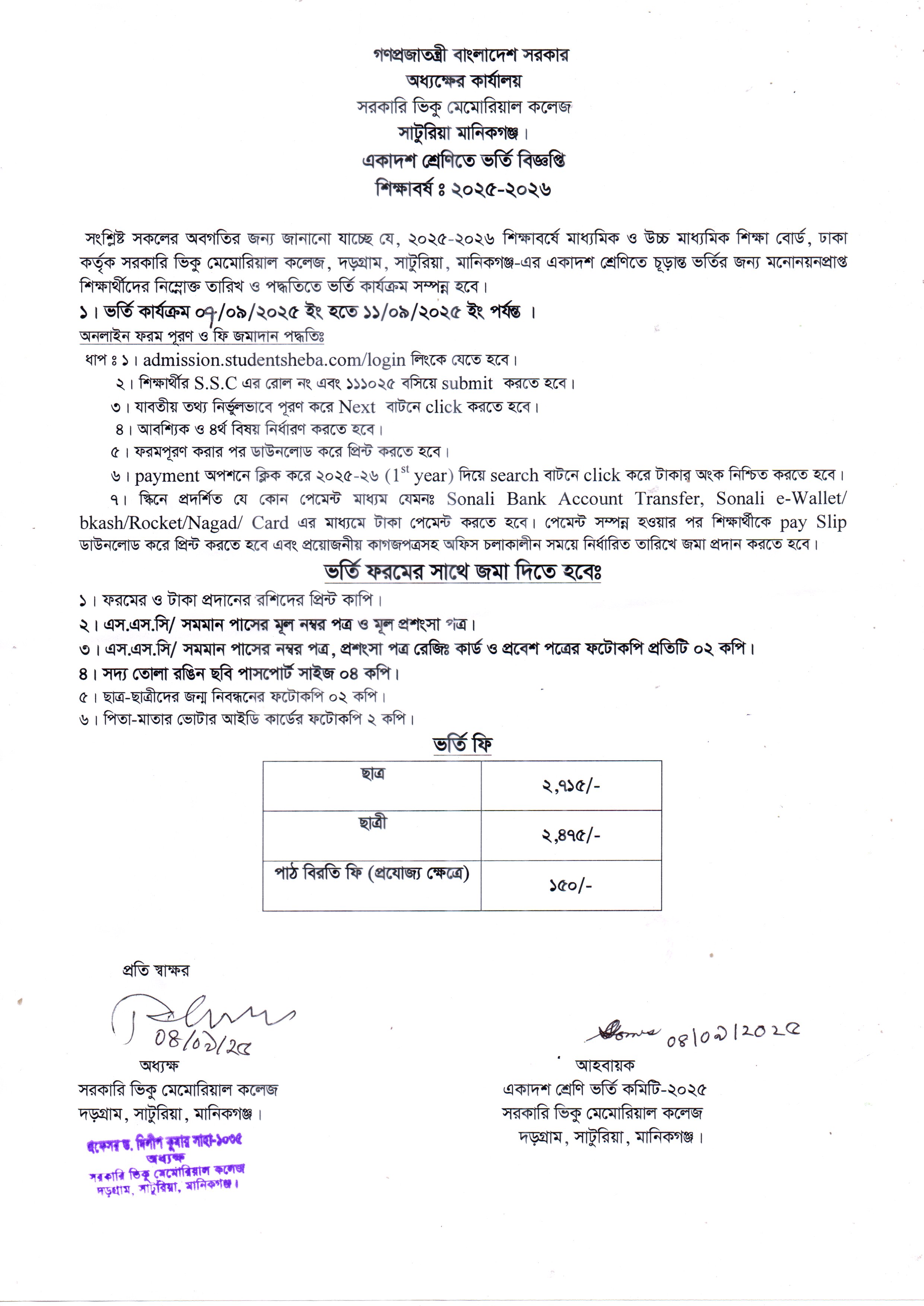২০২৫-২৬ শিক্ষাবর্ষে একাদশ শ্রেণিতে ভর্তি বিজ্ঞপ্তি প্রকাশ। |