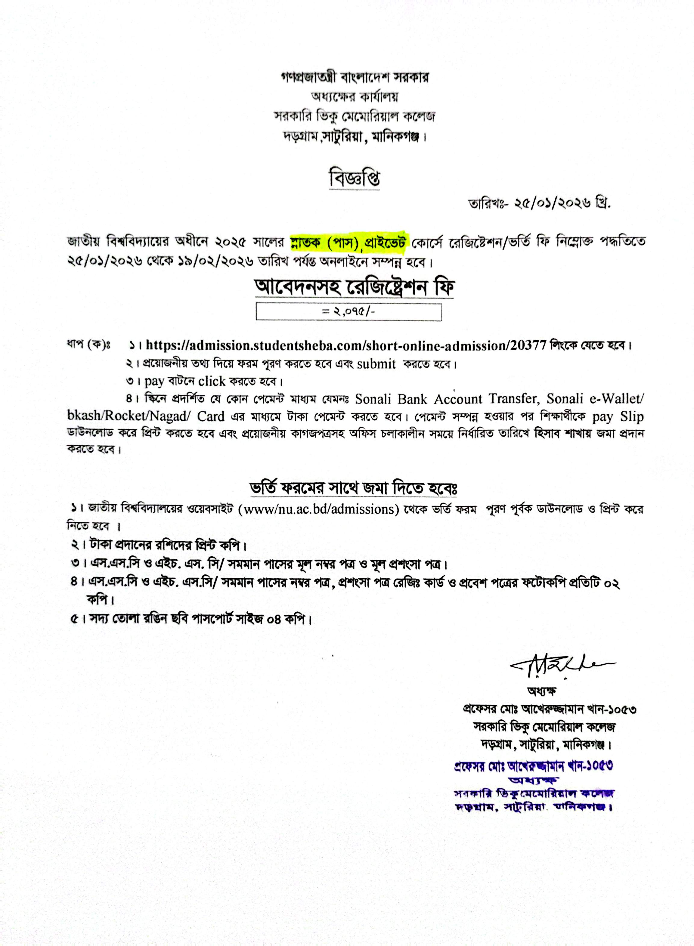 5 সরকারি ভিকু মেমোরিয়াল কলেজে ডিগ্রি প্রাইভেট কোর্সে ভর্তির বিজ্ঞপ্তি প্রকাশ। 26/01/2026