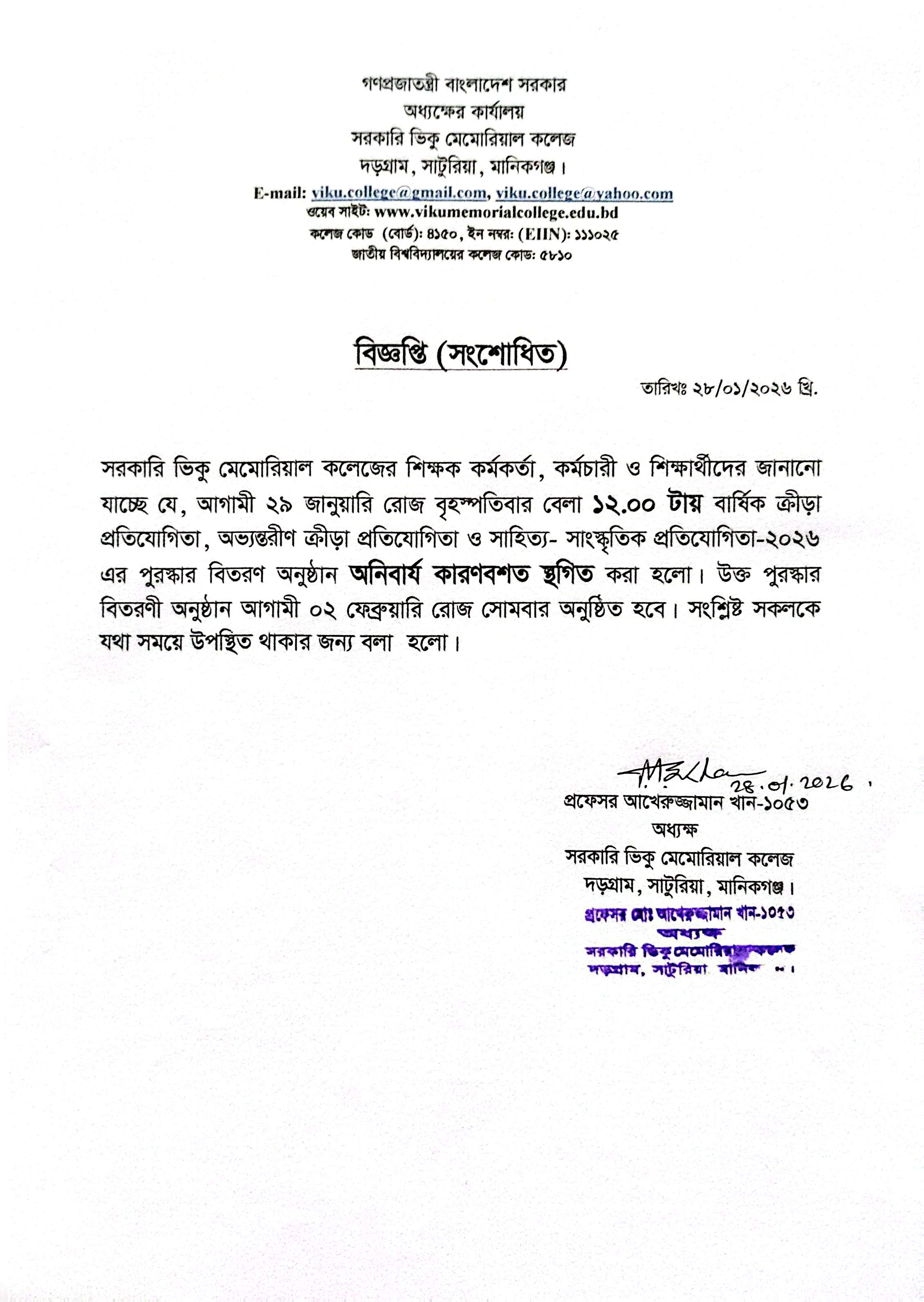 3 বার্ষিক ক্রীড়া প্রতিযোগিতার পুরস্কার বিতরনী অনুষ্ঠানের সংশোধিত বিজ্ঞপ্তি প্রকাশ। 28/01/2026