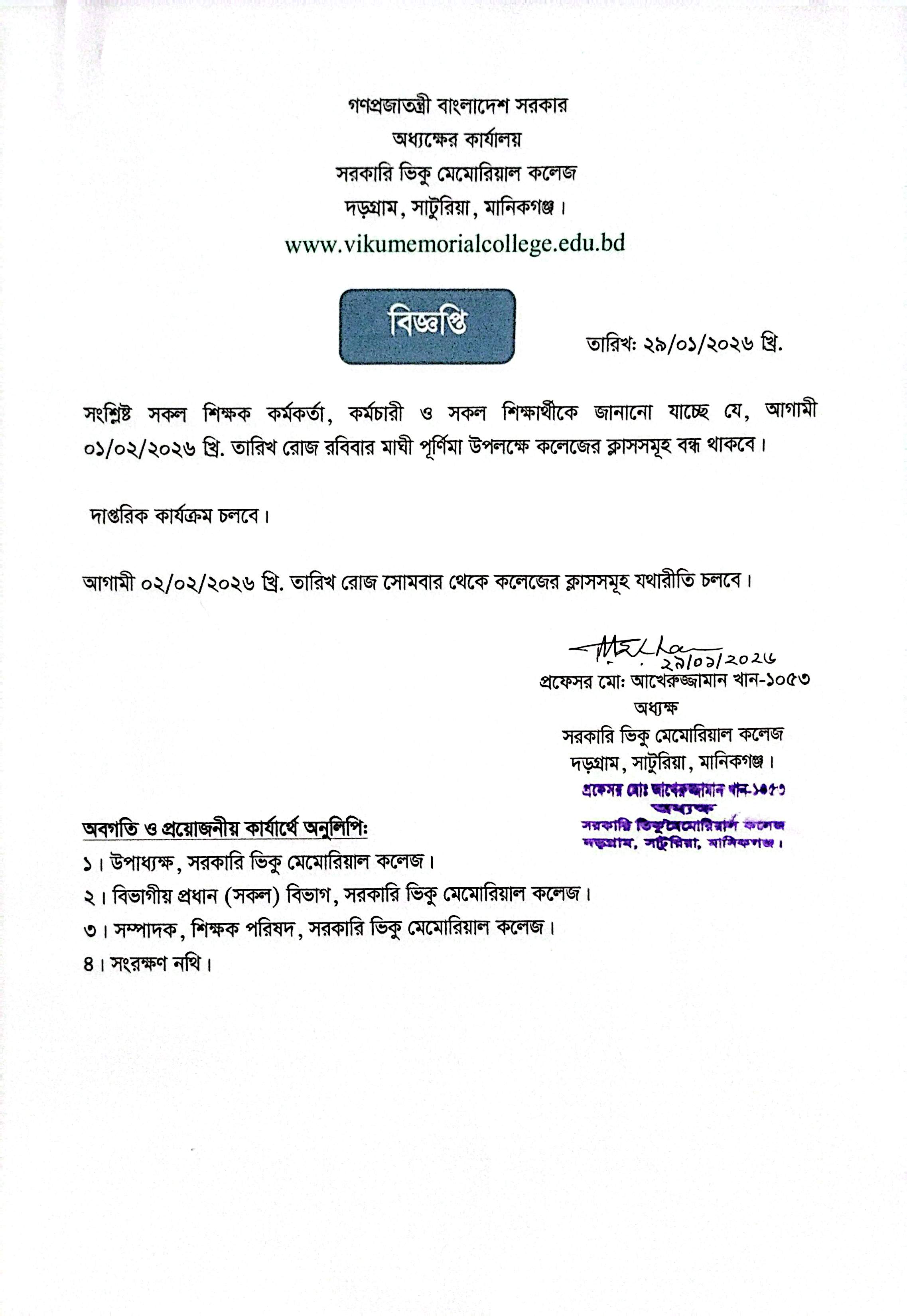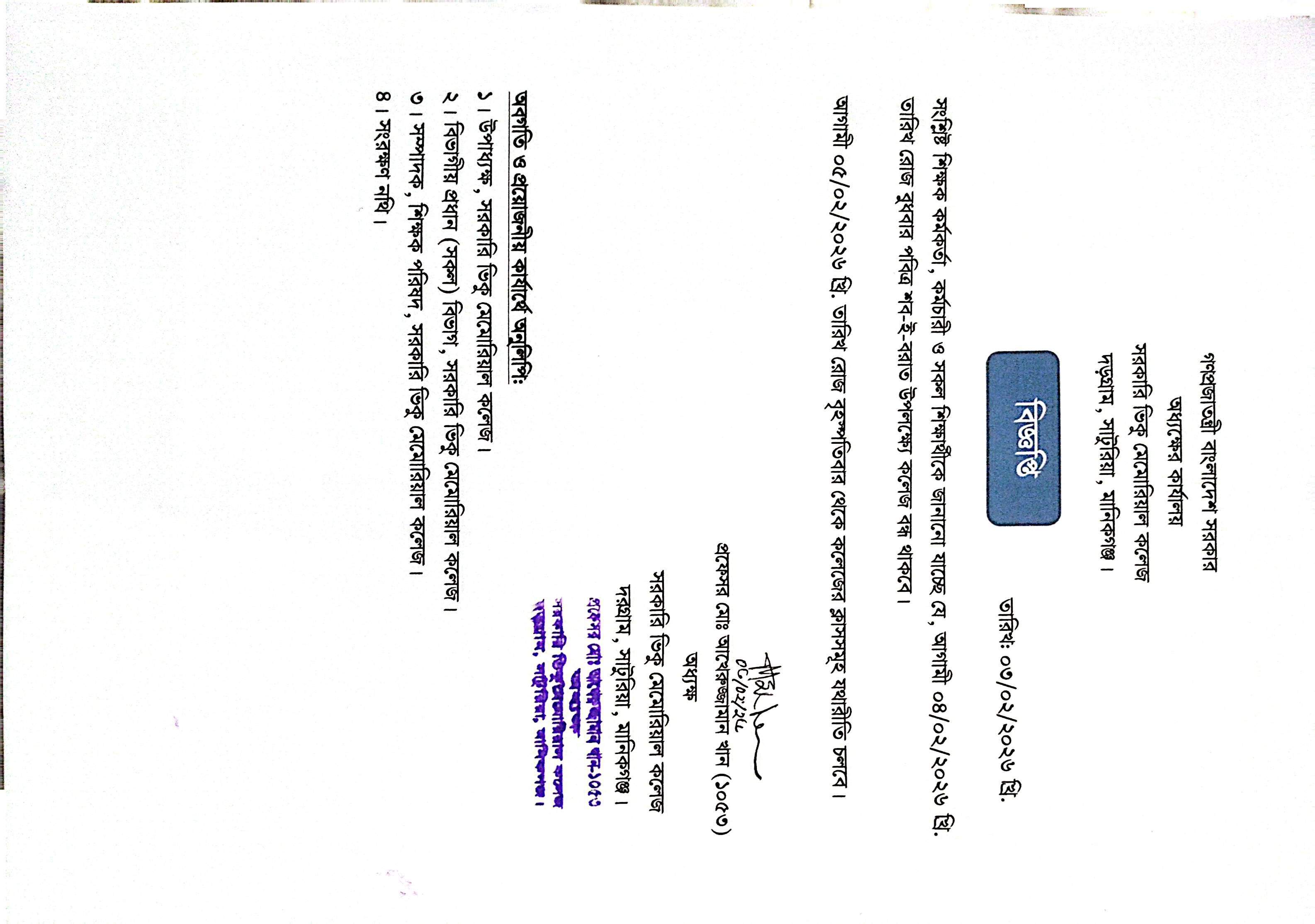 1 কলেজ বন্ধের নোটিশ প্রকাশ। 03/02/2026